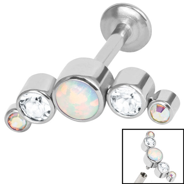 1.2mm Titanium Internal Thread Labret feature a crescent with a Central 4mm Opal & 4 Jewelled Crescent. Attachment Width - 13mm.