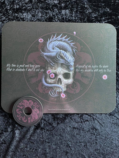 Classic Style Spirit Board depicting the Anne Stokes Oriental Skull on front & poem inscription on back. Comes with a planchette & Instructions for Spirit Readings.